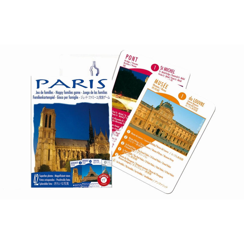 Jeu de 7 familles pour (re)découvrir Paris avec ses musées, parcs, monuments, places, églises, rues et ponts. Les jeux Piatnik de la gamme Paris sont traduits en 6 langues: français, anglais, allemand, espagnol italien et japonais.