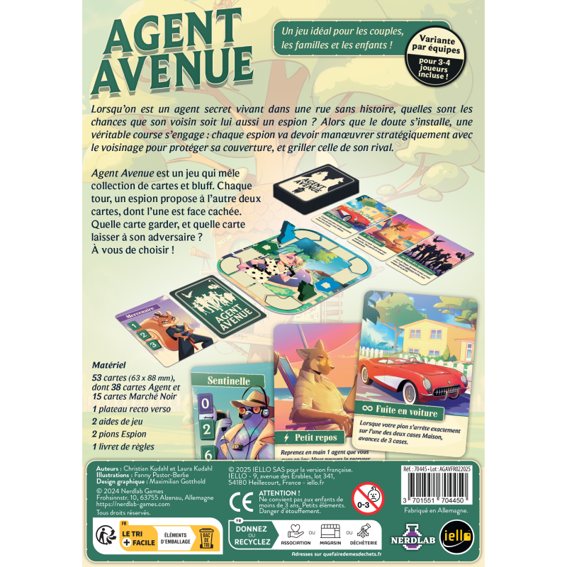 Agent Avenue est un jeu de cartes compétitif pour 2 joueurs qui combine le bluff, course et collection. Incarnez des espions à la retraite planqués dans un quartier de banlieue, au sein d’un monde anthropomorphique coloré. Votre but ? Démasquer votre voisin et prouver que c’est un espion en vous livrant à une course tactique d’anthologie.