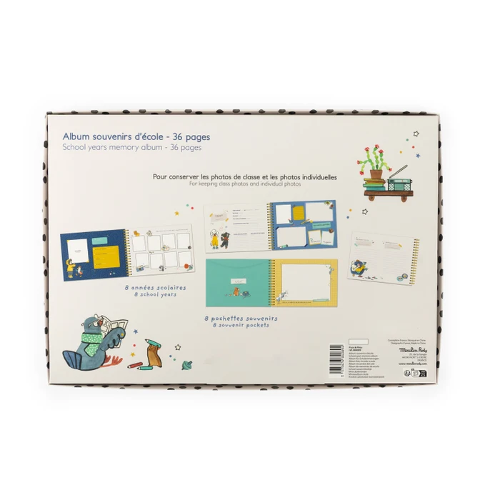 L'album à spirale Puce & Pilou accompagnera les enfants dans leurs meilleurs souvenirs d'école. Doté de 36 pages pour 8 années scolaires, il sera le lieu d'expression des souvenirs avec des pages de photos, de présentation, des pochettes à trésors...