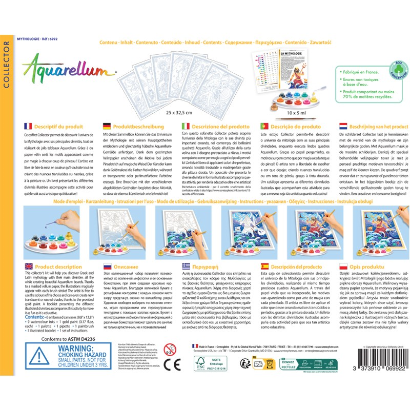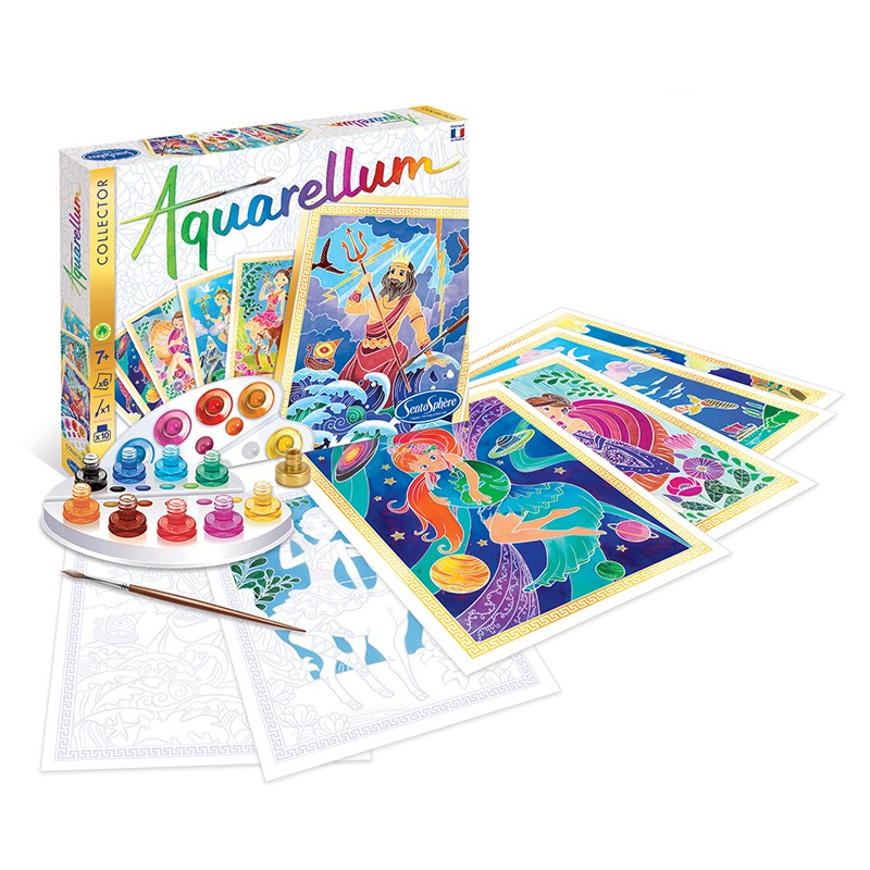 Ce coffret Collector permet de découvrir l’univers de la Mythologie avec ses principales divinités, tout en réalisant de jolis tableaux en profitant de la technique d’Aquarellum. Grâce à du papier vélin serti, les motifs apparaissent comme par magie à chaque coup de pinceau ! L’artiste est libre de faire la mise en couleur qu’il souhaite tout en créant des dégradés ou des nuances translucides ou nacrées, grâce à la peinture or. Un livret présentant les différentes divinités illustrées accompagne cette activité pour qu’elle soit aussi artistique qu’éducative !