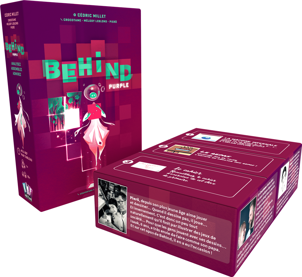 Découvrez Behind : Purple, la seconde boîte de Behind, le jeu coopératif de déduction dont l'originalité et l'ingéniosité ont été récompensées d'un As d'or Initié en 2025. Embarquez pour 3 nouvelles enquêtes, avec chacune leur logique et leur univers : "la Machine Infernale" de Crocotame, "Le Repas " de Melody Leblond et enfin "Le Cahier" de Pierô et Isaak.
