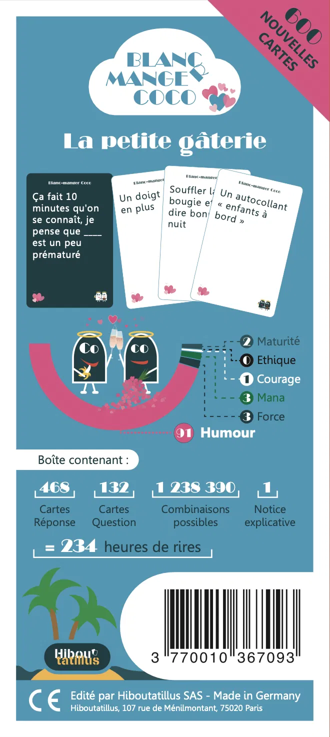 Au début de la partie chaque joueur reçoit 11 cartes Réponse. Un premier joueur, le Question Master, pioche une carte Question, composée d’un texte à trou, et la lit aux autres joueurs. Chacun choisit la carte Réponse qu’il trouve la plus drôle pour compléter la phrase, et la transmet face cachée au Question Master. Le Question Master lit les Réponses et sélectionne celle de son choix. Celui qui l’a jouée marque un point. Pour gagner, il faudra réussir à faire les associations de cartes les plus délicieusement drôles ! Grâce à des règles expliquées en 1min, on peut se lancer immédiatement dans une partie de Blanc Manger Coco : la Petite Gâterie. À l’apéro ou en soirée, c’est le jeu d’ambiance tout indiqué pour rire de tout ! Cette édition est particulièrement efficace pour célébrer les EVG et EVJF, rire entre couples ou juste entre adultes à l’heure de l’apéro.
