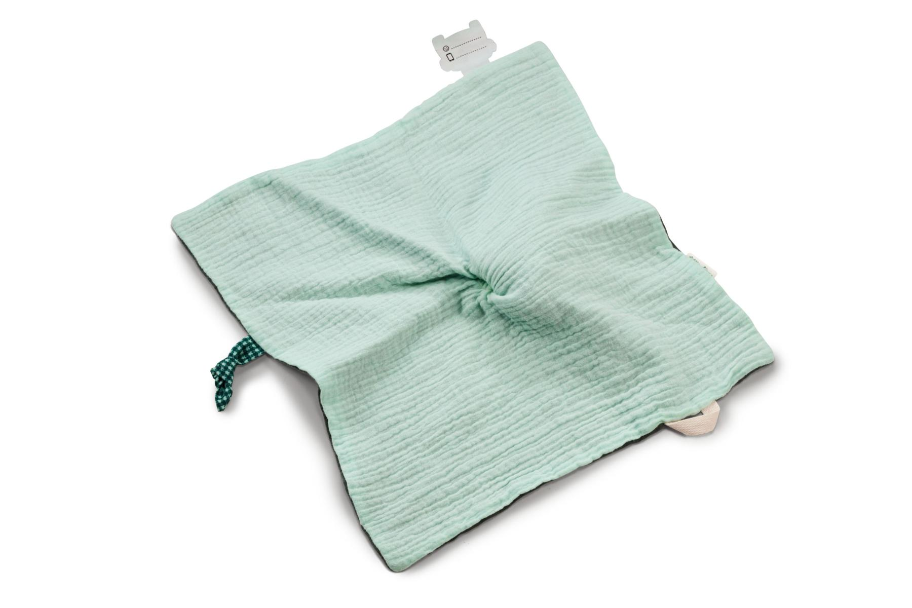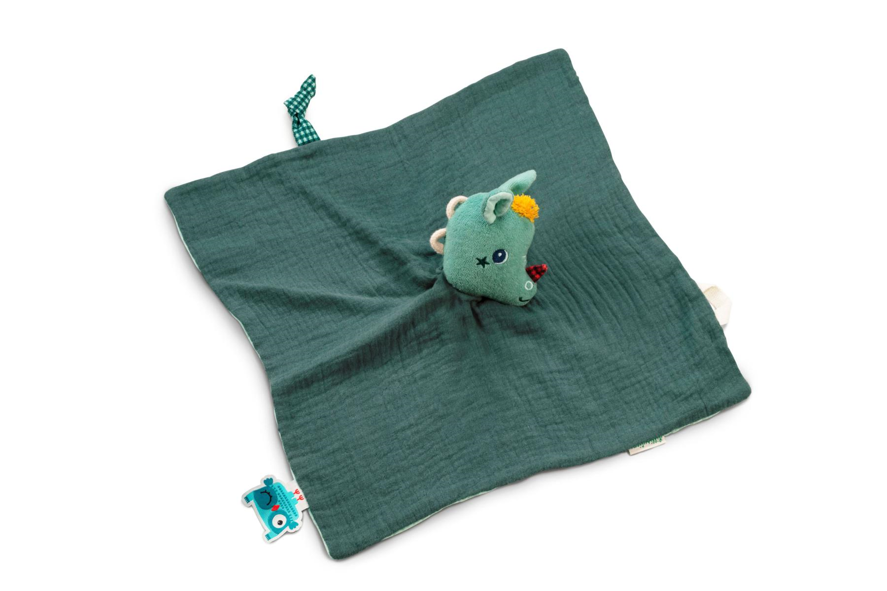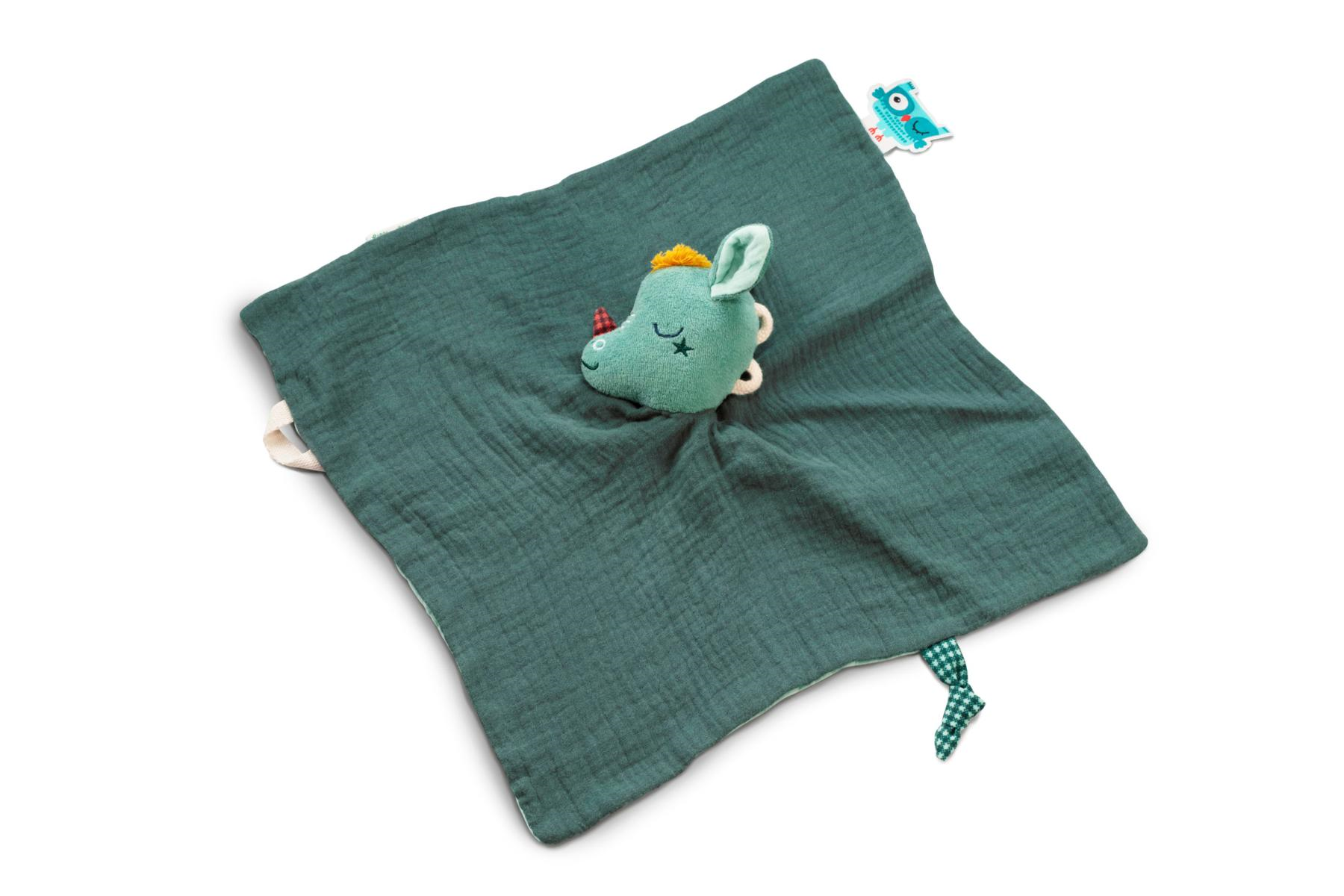 Ce doudou en coton organique offre du réconfort aux plus petits. La petite tête est une marionnette à doigts et le petit bouton permet d'attacher la tétine.