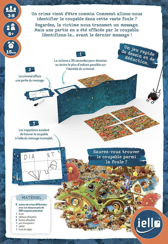 3 à 8 joueurs se divisent en trois rôles. Une victime. Un coupable. Des enquêteurs. Le crime a eu lieu dans la foule : identifier le coupable sera donc particulièrement complexe. Mais heureusement, la victime peut encore transmettre des indices aux enquêteurs quant à l’identité du coupable. Feutre effaçable en main, elle peut écrire ou dessiner des informations permettant de l’identifier sur une ardoise découpée en 9 cases. Attention : la victime ne dispose que de 30 secondes pour composer son message. L’ardoise est ensuite transmise… au coupable.