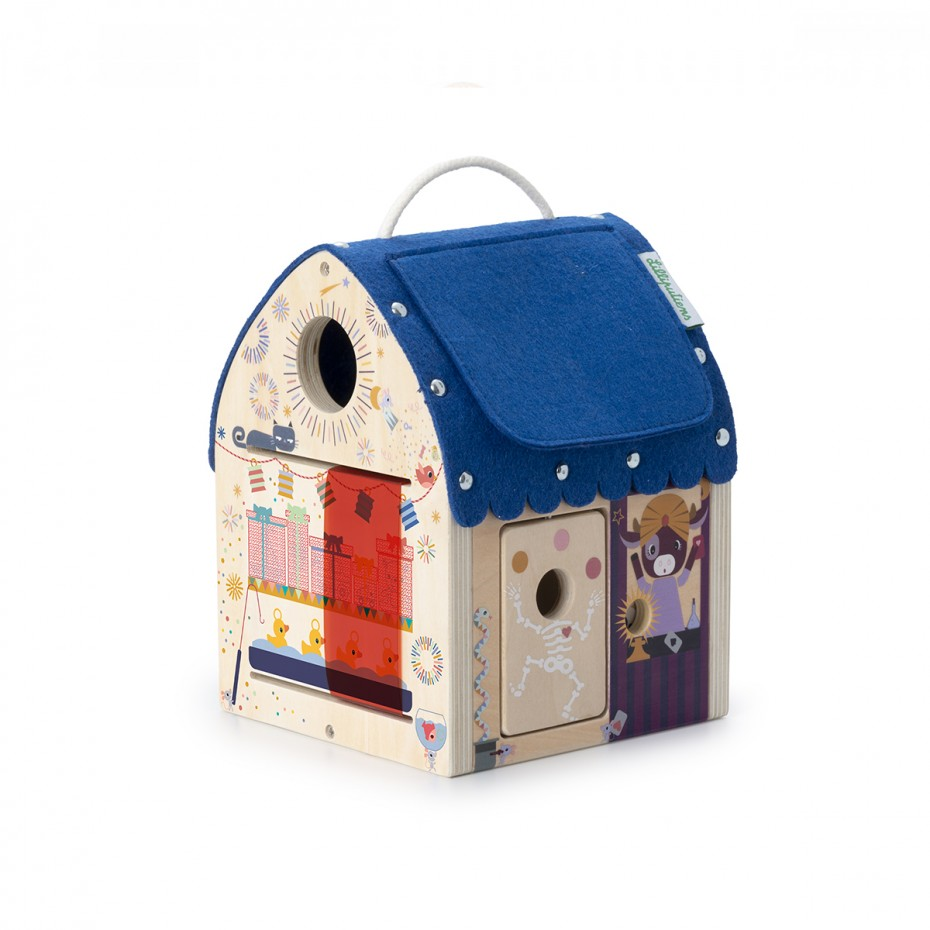 Approchez, approchez ! Entrez dans la maison des illusions optiques de Joe le Dragon ! Cette maison en bois et ses personnages ont été pensés pour la stimulation visuelle des enfants, dès 3 ans. Sur toutes les faces, et même le toit de la maison, 7 activités ludiques et amusantes sont à découvrir ! Joe est un dragon magicien qui adore se cacher, surprendre et faire apparaitre des surprises, sous les yeux captivés des petits. Parmi les activités disponibles, vous trouverez : un kaléidoscope amovible, pour voir le monde d'une nouvelle façon ; une scène qui s'ouvre pour faire apparaitre un miroir reflétant les illustrations des 3 cartes fournies ; une porte avec rubans par laquelle le petit personnage de Joe entre et sort ; une mollette à faire tourner pour savoir quelle prédiction fera notre amie Rosalie la vache ; une roue avec une spirale pleine de couleurs à faire tournoyer ; un filtre rouge à faire coulisser pour trouver des objets cachés ; une porte à faire tourner pour découvrir un gentil squelette ou un fantôme. Bien-sûr, l'intérieur de la maisonnette est accessible par le toit ou en regardant au travers des ouvertures : que s'y cache t'il ? Cette maison en bois Lilliputiens mesure 15 x 15 x 20 cm et est joliment illustrée sur le thème de la fête foraine : des ballons, des fanions, des confettis ... Tant de détails à observer tout autour de la maison ! Ce jouet d'activité en bois permet également aux enfants de développer leur imagination, car de folles aventures sont possibles dans un univers empreint de magie ! Ils développeront aussi leur motricité en manipulant toutes les mollettes et ouvertures.