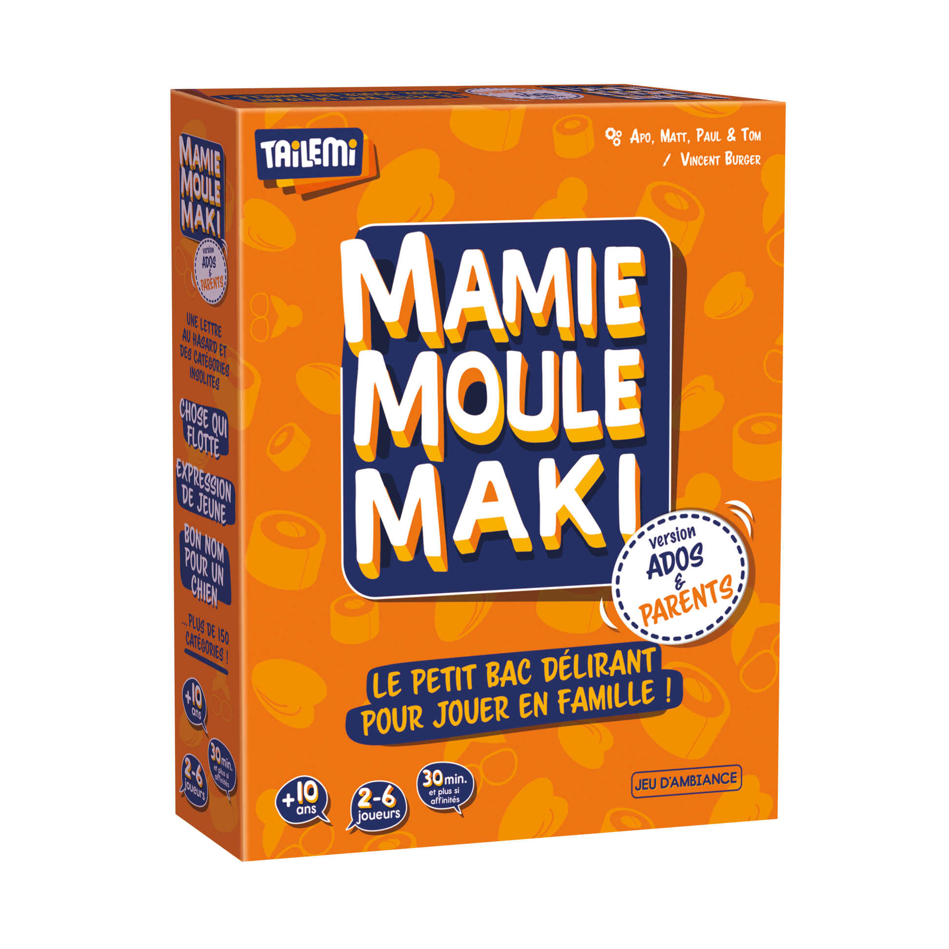 Mamie Moule Maki version Ados & Parents est un jeu simple, accessible, et idéal pour animer une soirée en famille. Il favorise l’échange, la créativité, et l'humour, sans jamais devenir trop complexe.