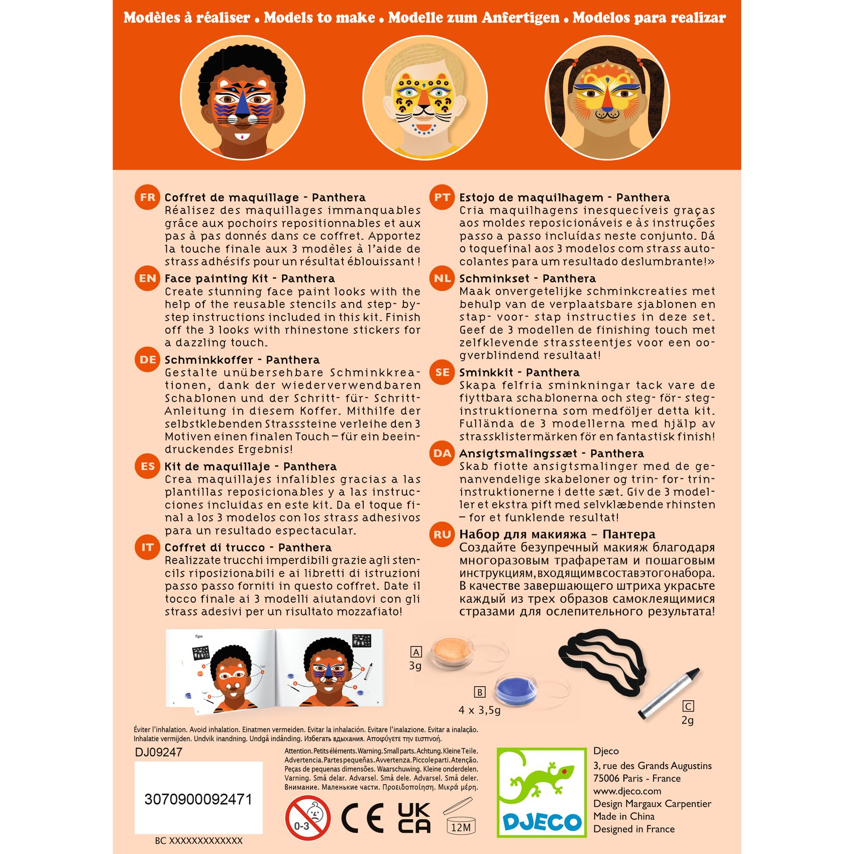 Tigre féroce, guépard supersonique ou lion majestueux… Grâce à ce kit de maquillage, les enfants se glissent dans la peau de leurs animaux préférés et imaginent des histoires palpitantes ! Et avec encore plus de modèles disponibles, la savane n’a jamais été aussi grande : de nombreuses idées pour jouer et rugir de plaisir !