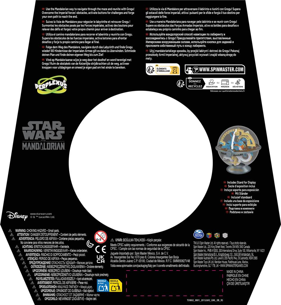 Avec le Perplexus STAR WARS™ THE MANDOLORIAN™, faites-rouler votre bille avec adresse dans ce labyrinthe dont les obstacles puisent leur inspiration dans la célèbre série. À l'intérieur de cette sphère transparente, relevez les défis du labyrinthe, jusqu'à libérer Grogu, l'Enfant prodige. Patience et persévérance seront nécessaires pour franchir les 80 obstacles 3D (dont plusieurs inédits) du casse-tête. Son niveau de difficulté et son diamètre correspondent aux modèles Epic et Portal, avec un parcours d'une longueur équivalente.