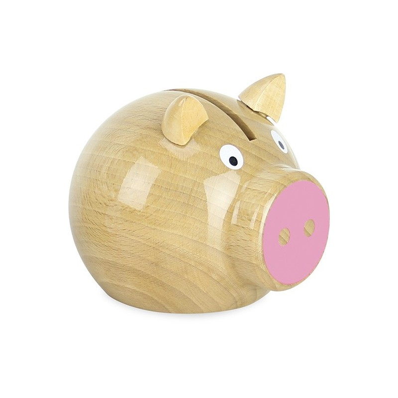 Tirelire cochon en bois massif. Bois naturel vernis et peinture rose. 100% Made In France.