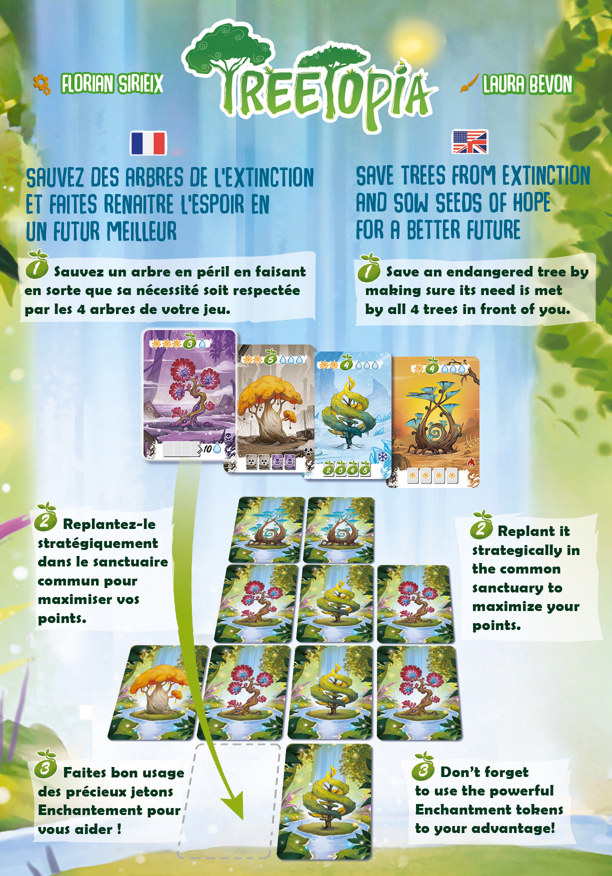Sauvez des arbres de l’extinction et faites renaitre l’espoir en un futur meilleur. Pour cela, vous devrez extraire des arbres de leur milieu hostile et les replanter dans un sanctuaire en respectant leurs nécessités uniques. Tâchez de regrouper les arbres de même type ou ceux en symbiose pour marquer plus de points d’espoir. La partie se termine immédiatement quand un joueur plante le dernier arbre complétant le sanctuaire. Le joueur qui aura généré le plus d’espoir sera déclaré vainqueur.